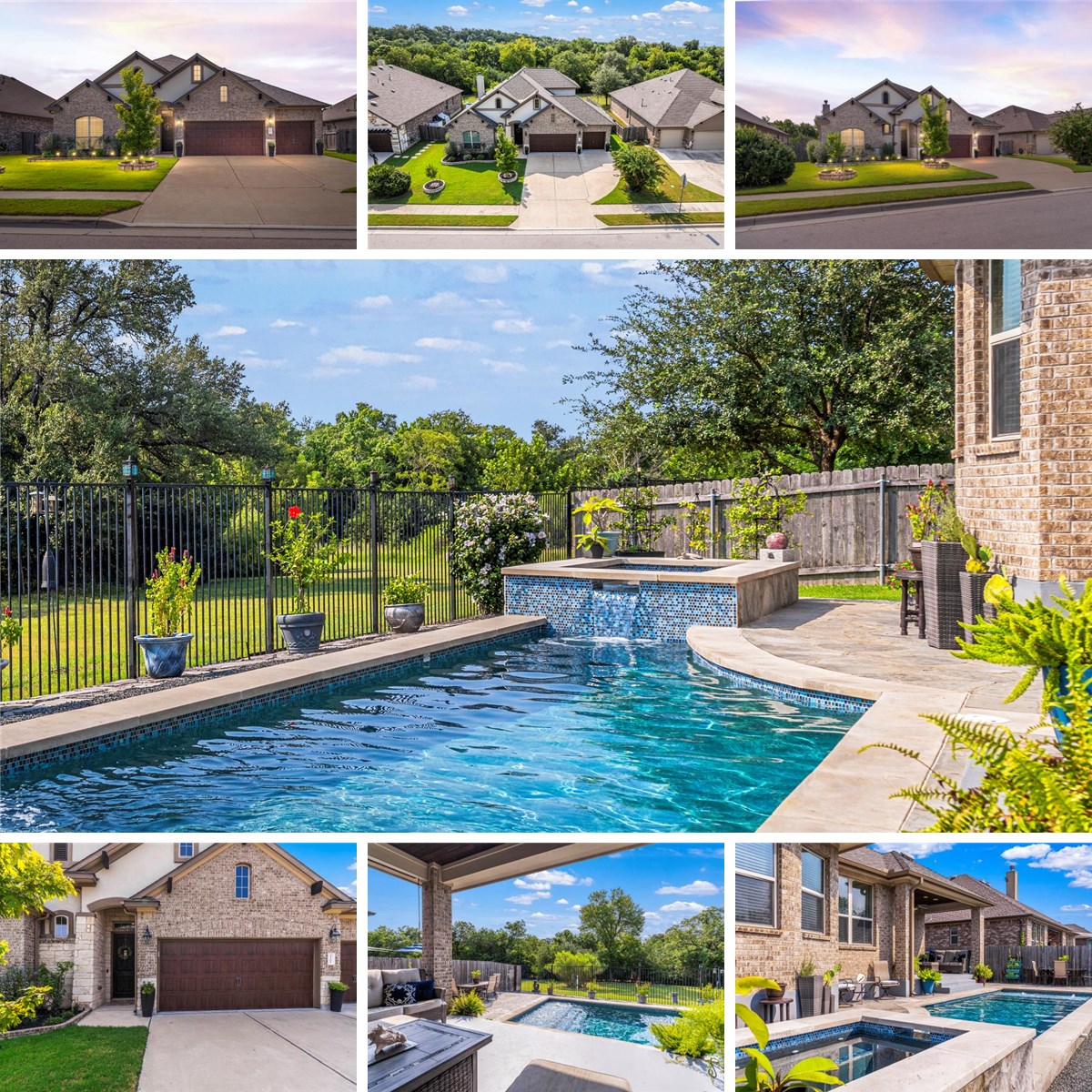 Backyard oasis: Blue Haven heated pool (6' deep, bubblers, lounge shelf, spa), landscaped yard, SW-facing for afternoon shade. Rear gate access to private greenbelt trails, Brushy Creek, and picnic areas.